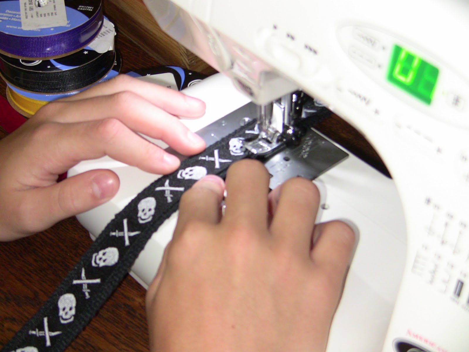 The kids and I started the week with a field trip to JoAnn Fabrics (try taking seven kids into that store...see what happens) so the kids could pick out two long ribbons and one short ribbon. The longer ribbons were mostly cut to order, so we got each cut to a quarter yard. A quarter yard was more than enough for one key chain. For the shorter ribbon that wraps around the key chain in the last step, I encouraged the kids to share spools of thin ribbon. That required some artistic juggling, but we managed.First step: sew together the two fat ribbons, using one line of stitching down each side.