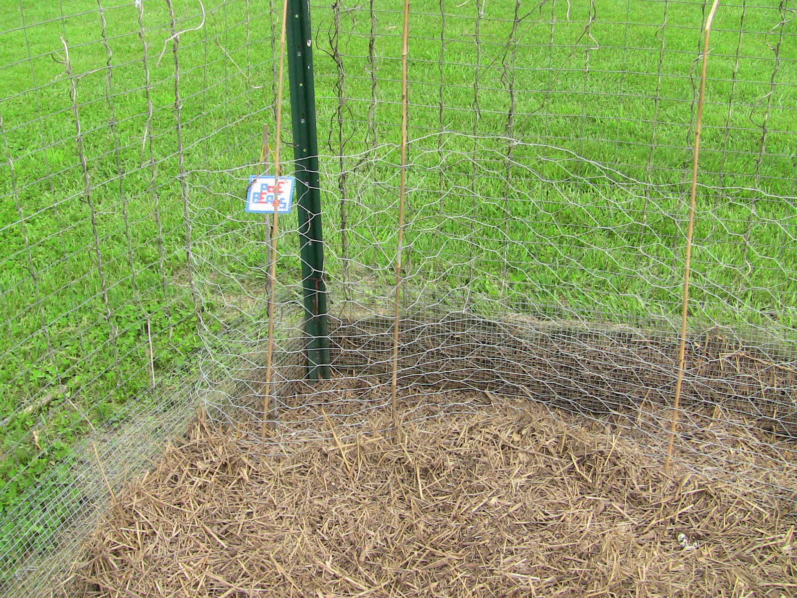 Rather than rotating the pole bean crop to a new garden with the squash and cabbage, we planted them in the same spot as last year.  Normally, that would be an invitation to the overwintered bugs for a repeat performance, but this year, the chickens are in that garden.  I installed rabbit fencing along one wall of their yard, with bamboo stakes for support (and for the pole beans to climb).  The pole beans are planted in between the rabbit fencing and the fenced wall of the yard.  So far, the chickens have not dug under the fencing. I'm *hoping* that by the time they undermine the rabbit fencing, the pole beans will be well-established.  Once the plants are tall enough, the chickens will do little damage to them.