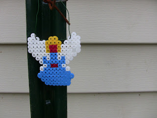My littlest guy has been on a fuse bead kick for a few weeks now, ever since we made plant row markers for the vegetable garden.  Usually when my children figure out that some sort of fun activity has a purpose, they no longer want to do it, but not this time.  "N" has made a fairy for the chickens, using a pattern that came with some of our fuse beads.  I hung the Red Faced Chicken Fairy on a pole in the chicken yard.  And I thought that pole had no purpose.  It was just waiting for the day when the Red Faced Chicken Fairy would arrive.