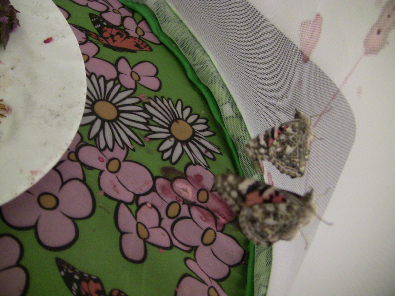 In the shot above, you can see the inside of the butterfly house, with two Painted Ladies clinging to the wall.  The red dye on the wall and floor of the house is leftover after their transformation from rather homely caterpillars to colorful butterflies.  We never before wondered where all that color comes from.  They make it themselves; how cool is that?
