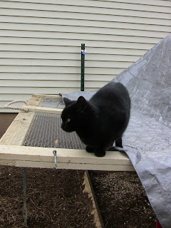 This day started off rather dreary outside, but upon closer inspection there was a bit of happiness coming up from the soil.  Look carefully in the picture above and you'll see two butterfly-shaped cabbage leaves sprouting.  I tried growing cabbage last year, with no luck.  I am trying again so that I'll have a nice supply of red cabbage for the chickens all summer.  (I'll eat some, too!)