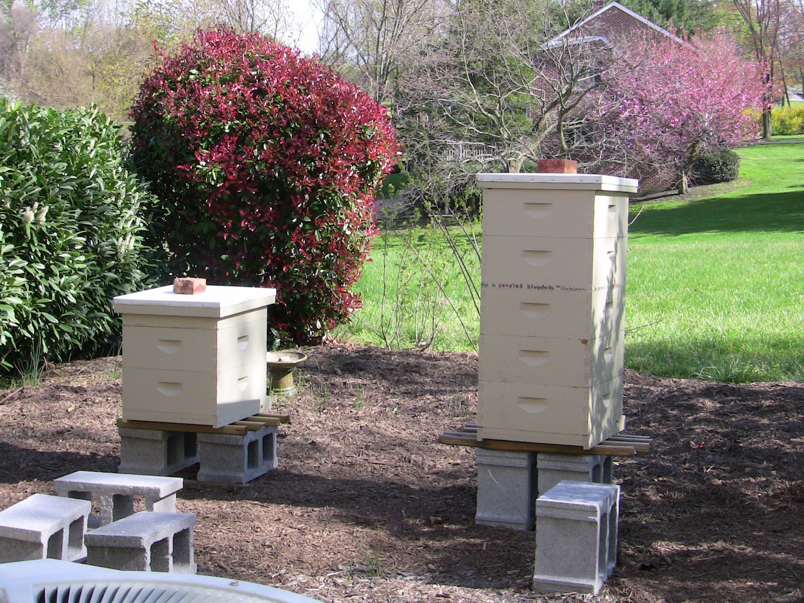 Another addition to our menagerie is a second Queen Bee.  Hers is the smaller hive.  The taller hive has two honey-supers on top.  We've been so unseasonably warm this year that we expect to harvest honey well before summer.