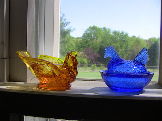 At the next sale, my friend picks up a brand new Pottery Barn vase (price tag still on, $20 value!) and the grandmother running this sale chimes, "You can have that! It's free."  I pick up the blue chicken seen in the photo and offer fifty cents (generous, IMO) and the lady grimaces and shakes her head.  She explains that a few dollars is more like what she had in mind.