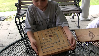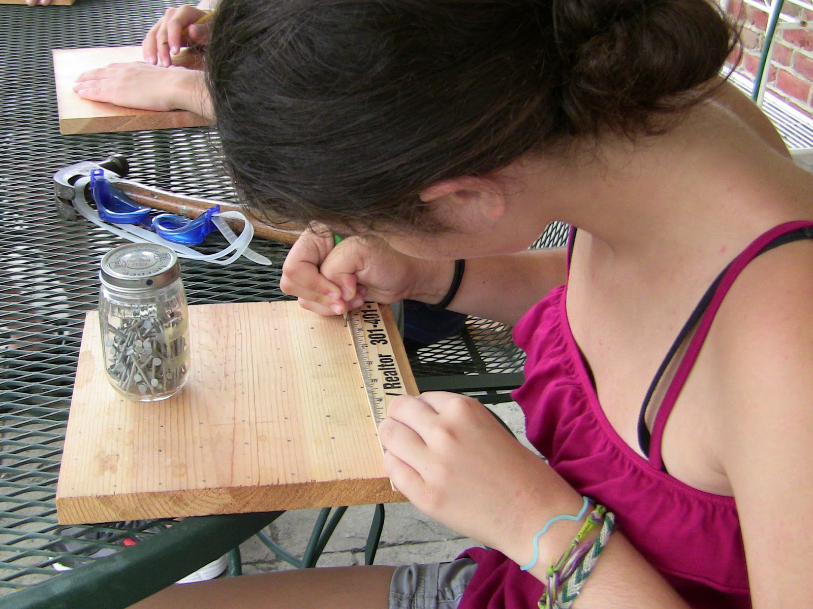 With some scrap wood, nails, and rubber bands, the cousins made marble mazes this summer at Camp Gramp. Using an old idea from Family Fun, we first made grids on large squares of wood, and then hammered nails at the grid intersections. I like any activity that gets kids hammering, since hammering is a great skill AND it is satisfyingly noisy!