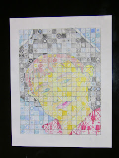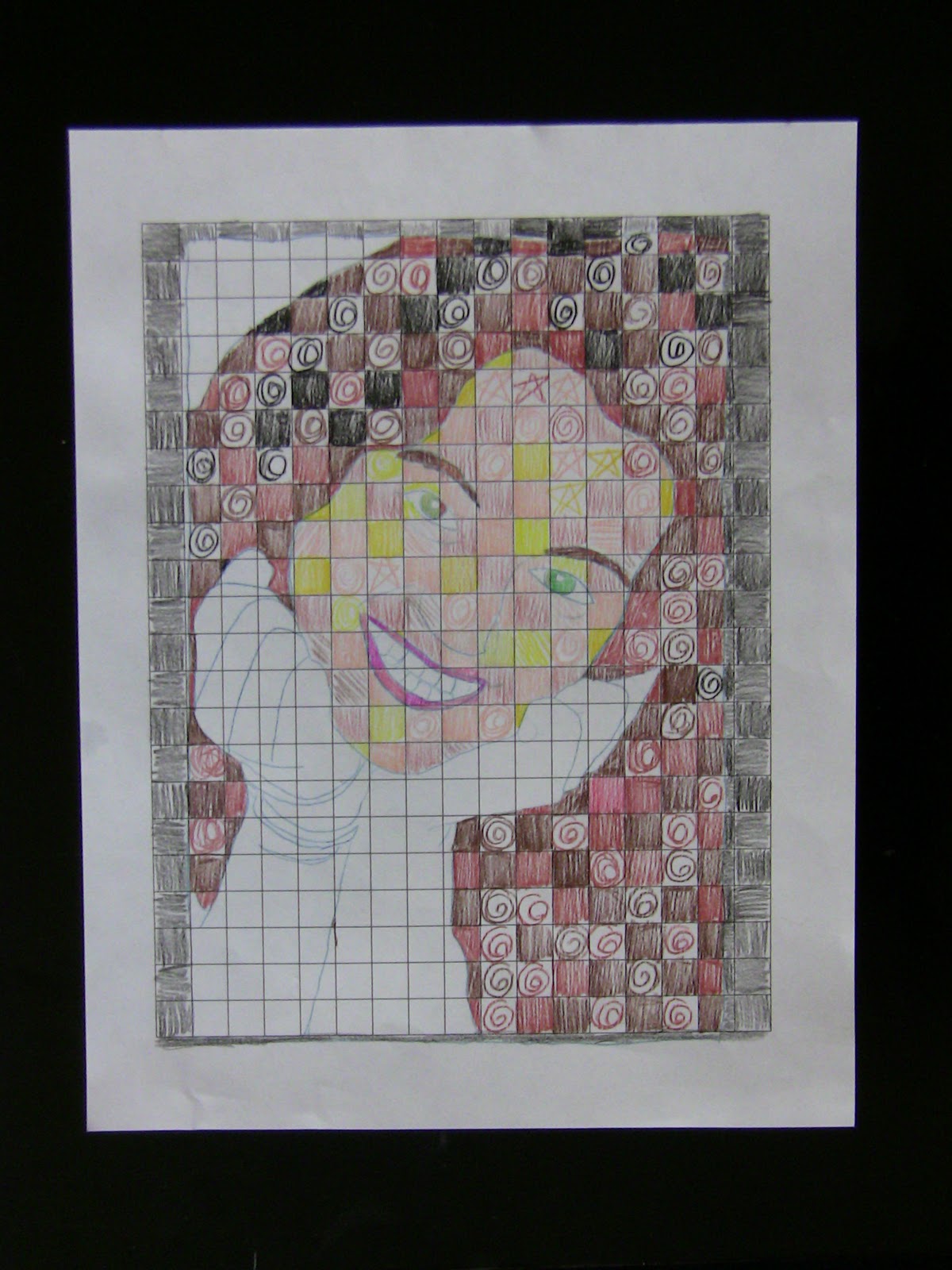 The next step was tedious, but creative. The kids colored each square of the graph paper with a different design, having no two adjoining squares match. The colors of the squares matched what the kids imagined would be the color of that part of the portrait (for examples, a variety of browns might compose the hair, a variety of pinks would make the lips).