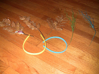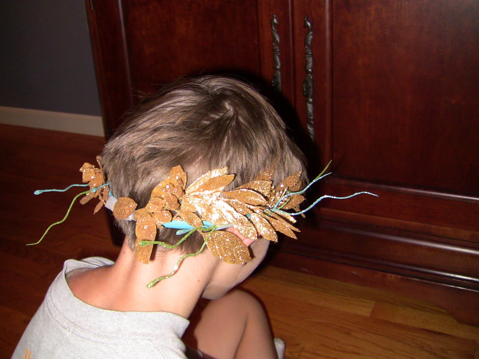 Using a headband and some sparkly leaves, it is easy to make a laurel wreath for a costume. (The blue and green sparkly sticks are seaweed for Poseidon.)