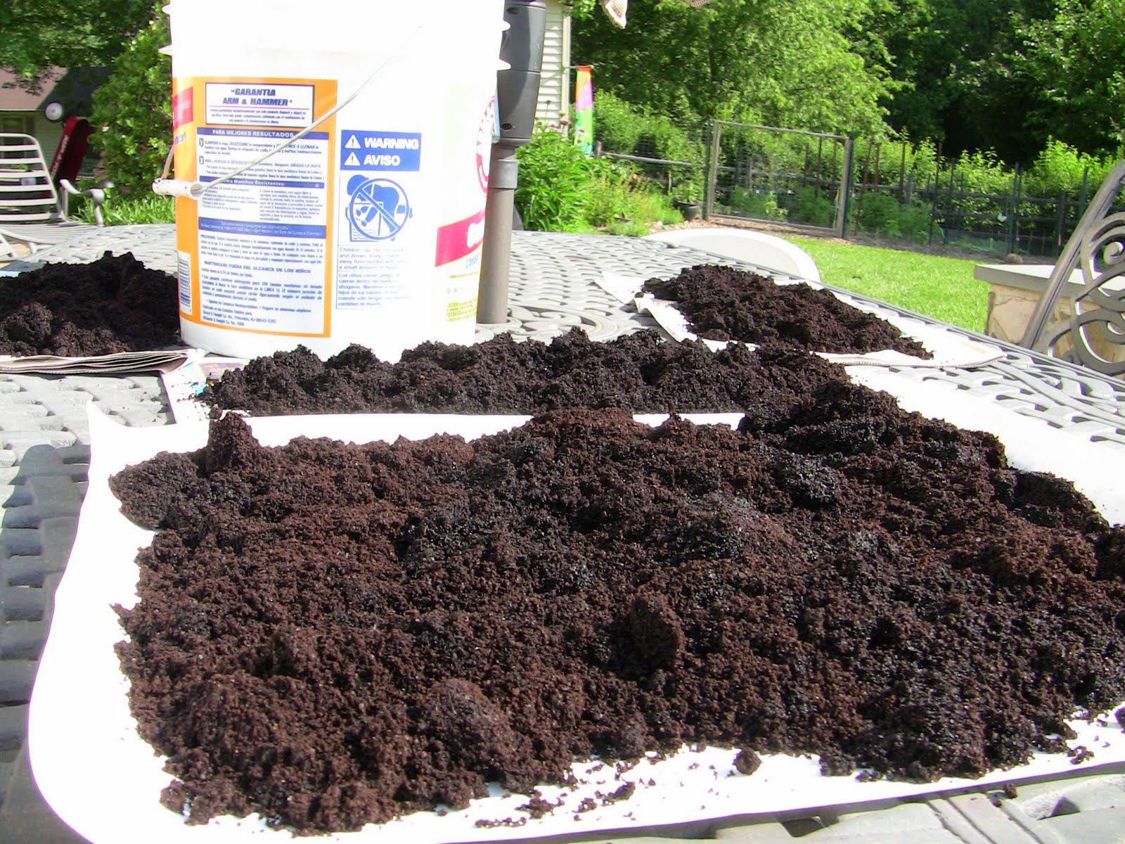 Those are coffee grinds. They are spread all over my patio to dry in the sun. The kind people at Starbucks have been giving me their leftovers so that the 400 cub scouts in our district day camp can make dinosaur fossils with me next week. My car, my yard, and my house smell like coffee.