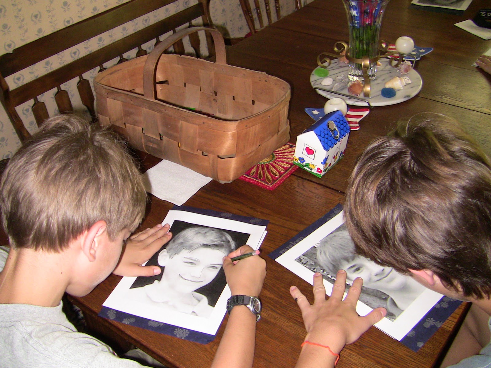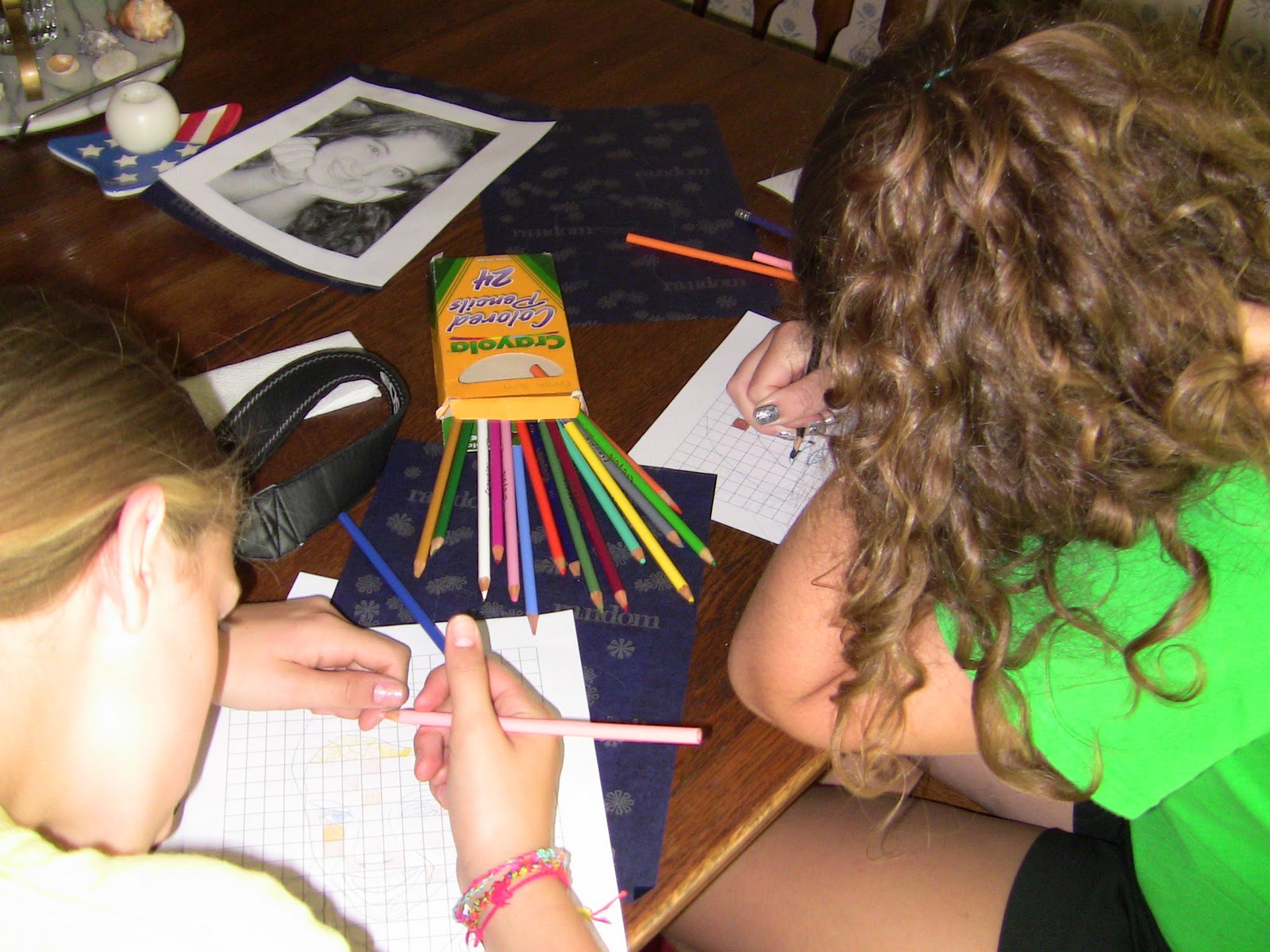 Inspired by a great activity from a great art teacher's site called Art Projects for Kids, the cousins made self-portraits this summer in the style of Chuck Close.