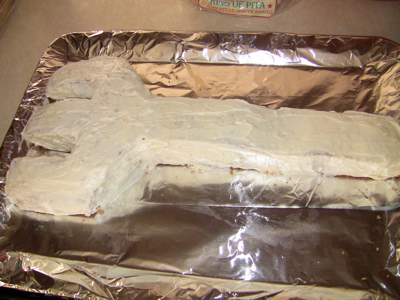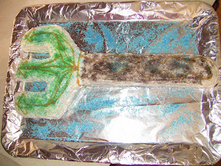 I baked this cake in a 9 X 13 glass dish. The top part of the trident was cut from the rectangle; from the discarded pieces, I shaped the bottom 'stick' of the trident.
