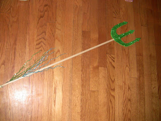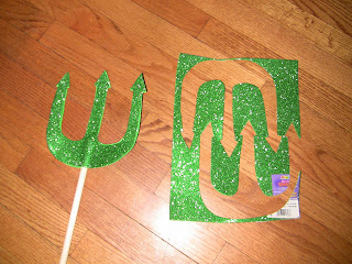 For his trident, I cut sparkly foam (it came with a sticky backing) for the front and back, and stuck the front and back together on a wooden dowel. Couldn't be easier!