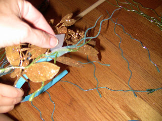 I used clear tape to wrap the leaf stems around the headband. If this was something I wanted to keep for a long time, I'd use floral tape, but I was aiming to just use this wreath for the party and perhaps reuse the materials afterwards.