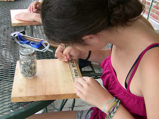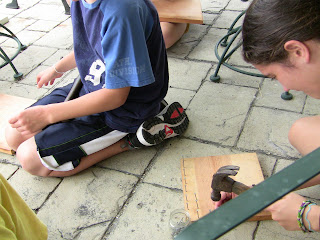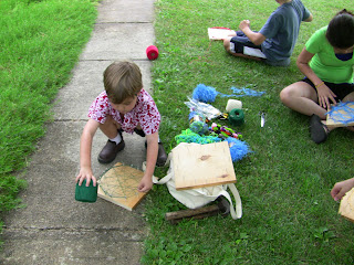 Having seen this craft a few years ago in Family Fun magazine, all those memories came back to me and I was determined to one day fit this craft into Camp Gramp. As usual, things don't always go as smoothly as I hope, and this year I was particularly busy during the week before Camp Gramp started. As a result, on the day of this craft, my father was busy cutting the wood while I was still searching his garage for appropriate nails. We weren't so well prepared.