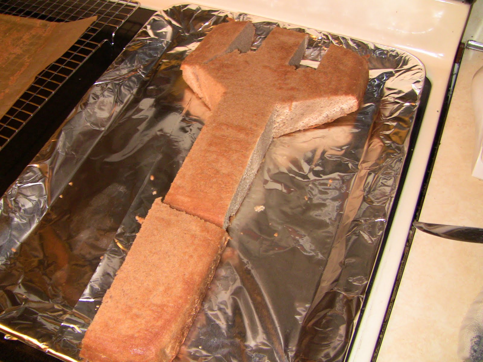 My son wanted a spice cake trident for the party. Normally, we like to bake from scratch, but I have found that to shape a cake, using a box mix is best. Cakes from a mix tend to be quite sturdy.