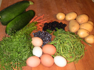 For dinner last night, we had an egg frittata with parsley, roasted potatoes, carrots, and zucchini, and a sweet ending of yogurt topped with blackberries, blueberries, and wineberries (not shown in the above picture--as I was mixing the berries with sugar and cinnamon, I sent my oldest child to go gather a cup of them from the woods; wineberries are the wild cousins of raspberries and are plentiful around here). The pole beans will be dinner tonight. : )