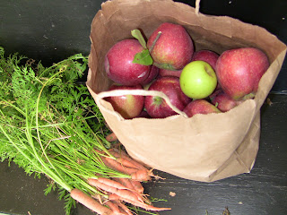 Things are starting to get busy around here! We've pulled in several pumpkins and countless tomatoes. Here are some more, stacked with potatoes in some very handy Clementine crates:
