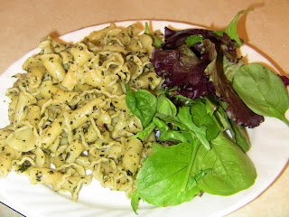She made a very simple salad while the noodles boiled. She tossed some fresh blueberries in a bowl of lettuce. It doesn't get too much more simple, but it'll do.