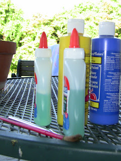 Making the shirts took about two days. First, we drew designs on plain t-shirts with gel glue. White glue tends to run too much for the look we wanted. We used white shirts, but any light color would work. It is important to put a plastic grocery bag or other barrier inside the shirt so that the glue and paint do not go through to the other side of the shirt.